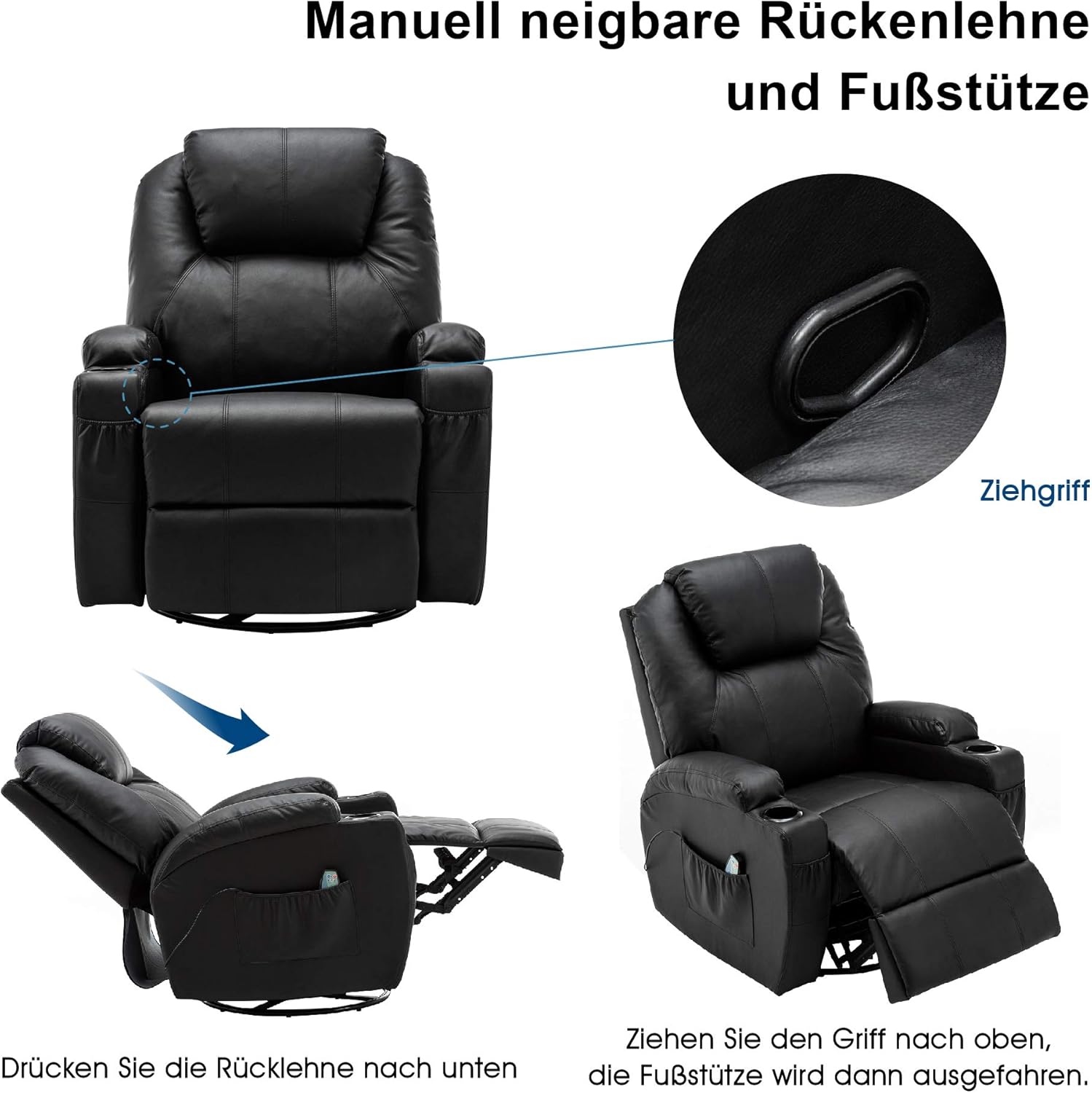 De fauteuil is handmatig verstelbaar en kantelt eenvoudig met lichaamsgewicht tot een ligpositie van ca. 140°. Dankzij het 360° draaimechanisme en de schommelfunctie biedt deze stoel extra bewegingsvrijheid en comfort.