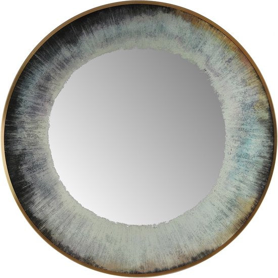 • Design: Runder Spiegel mit messingfarbenem Rand, ideal für ein modernes oder industrielles Interieur.