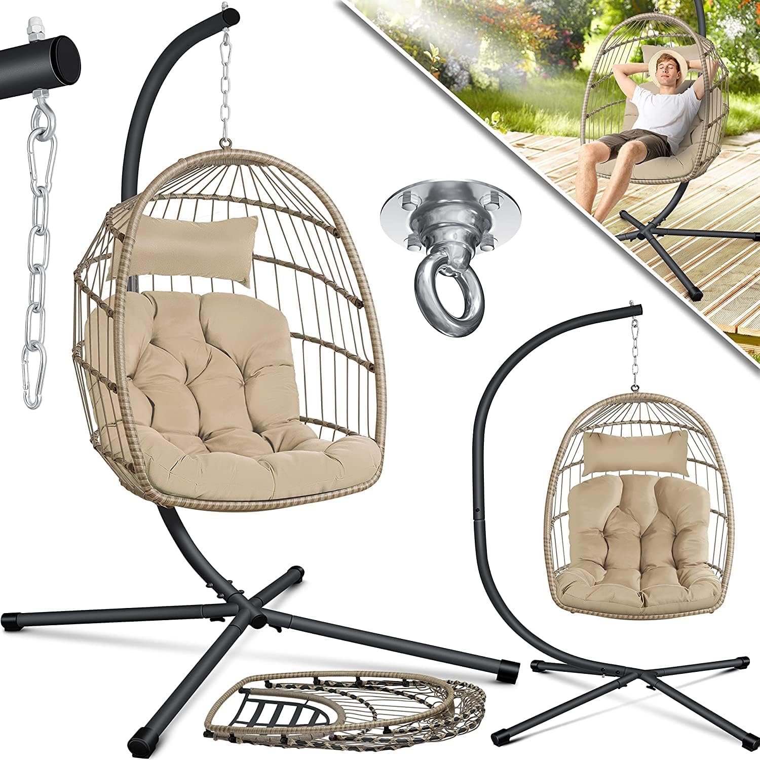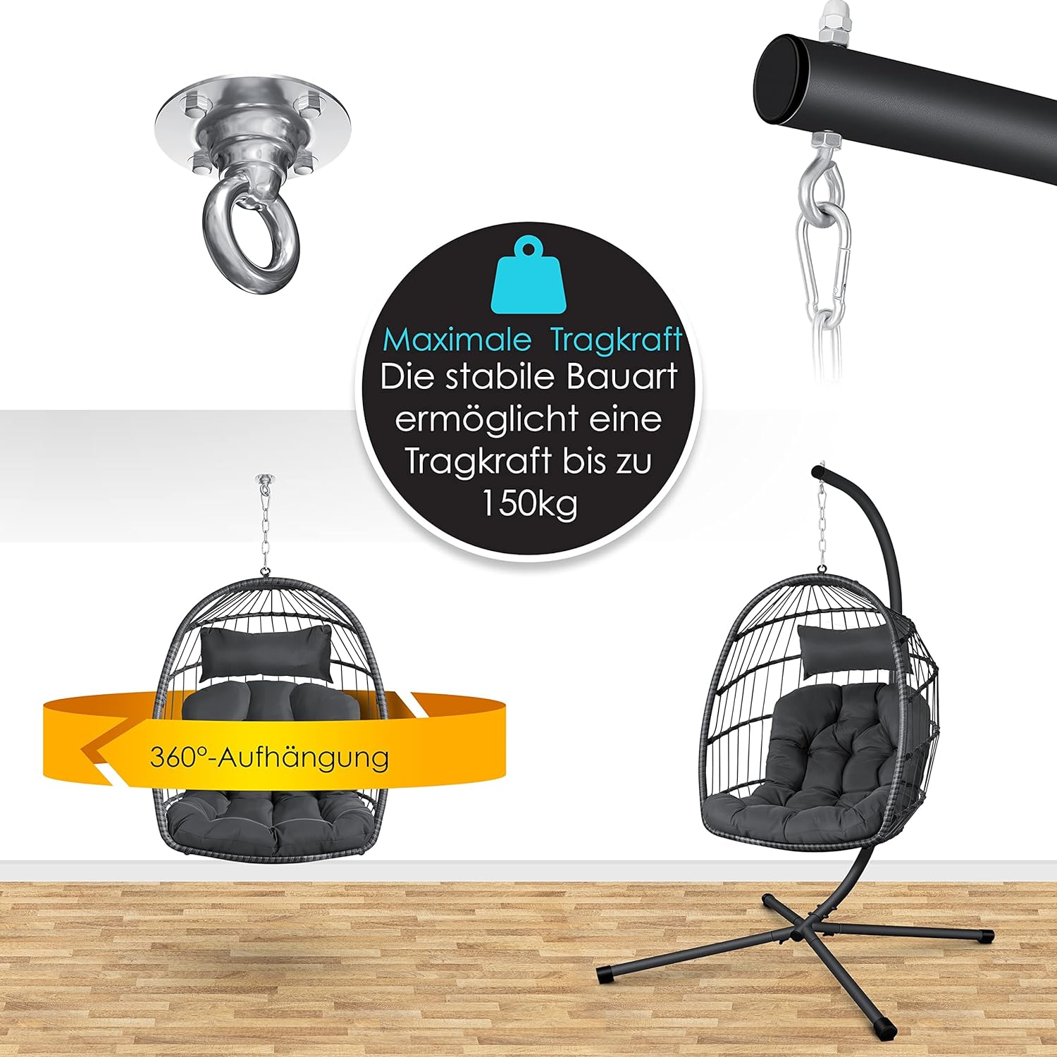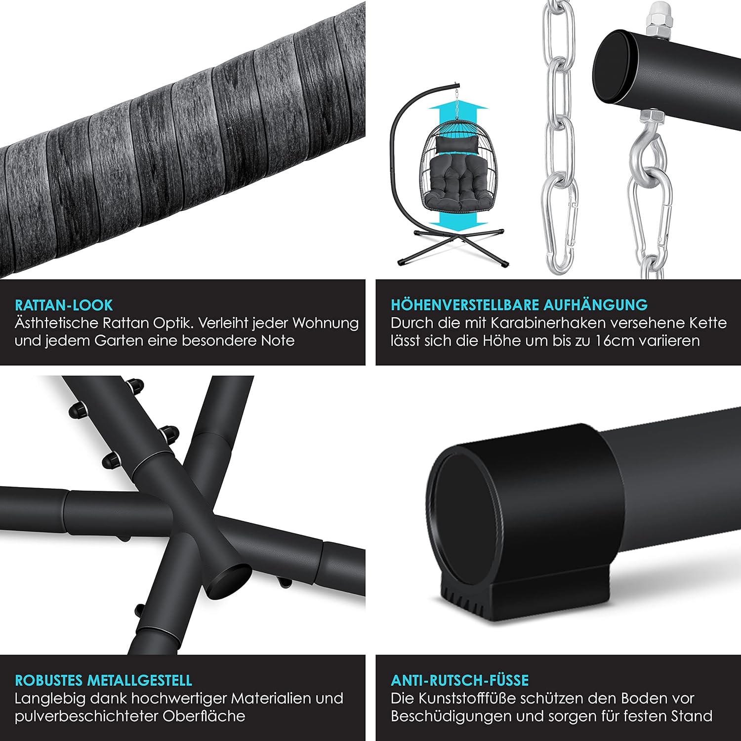 • Trwały i wytrzymały: krzesło wykonane jest z trwałego poliestru - obrotowe zawieszenie zapewnia 360-stopniowy komfort. Wraz z wysokiej jakości i wytrzymałym łańcuchem nasz wiszący kosz obiecuje długą żywotność i nośność do 120 kg. Wygląd rattanu nadaje Twojemu domowi i ogrodowi wyjątkowy charakter. Plastikowe nóżki chronią podłogę przed uszkodzeniem i zapewniają solidną pozycję na wszystkich podłogach.
