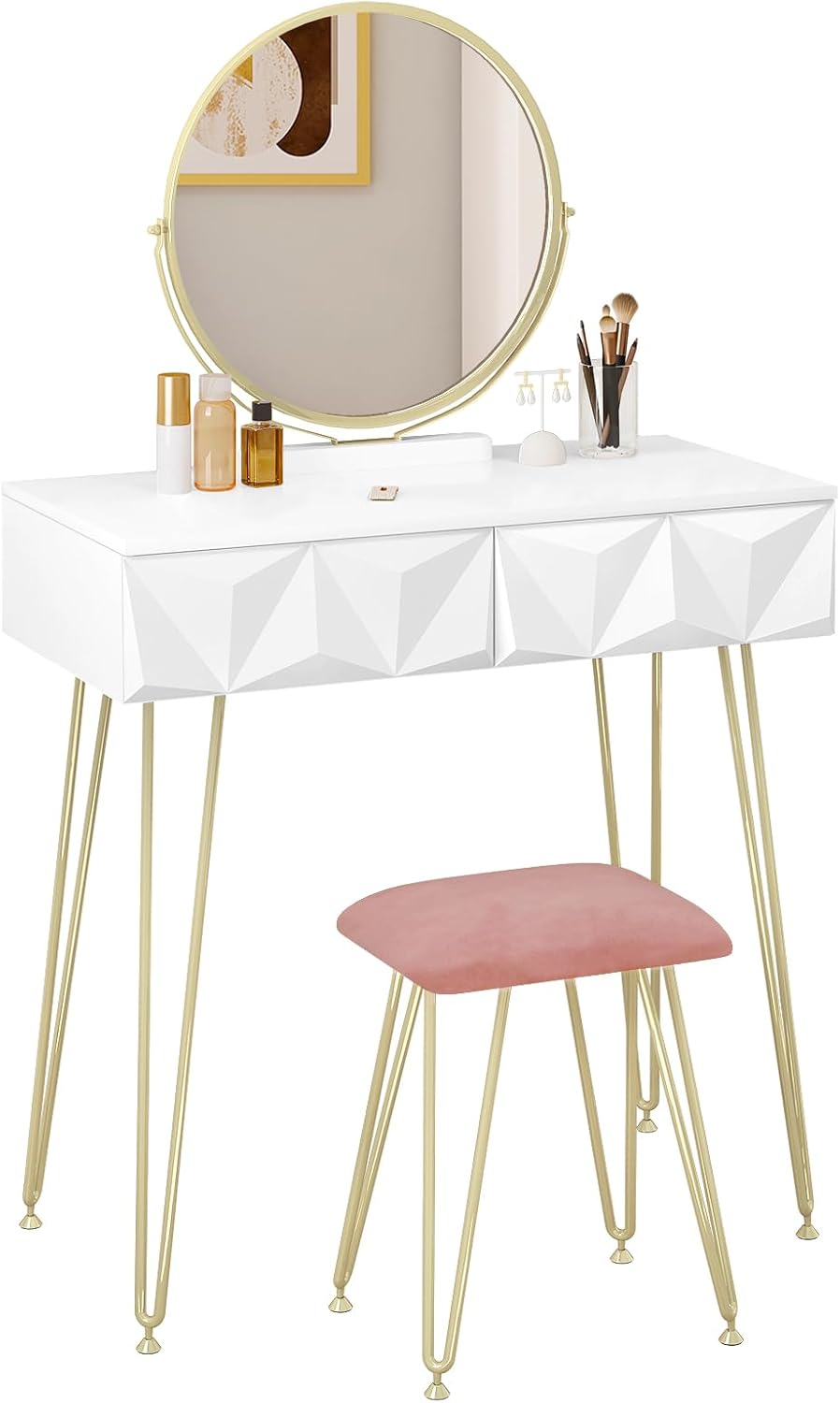 - Lustro i stołek: z pasującym aksamitnym stołkiem i obrotowym lustrem nowoczesna toaletka jest nie tylko piękna, ale i funkcjonalna. Możesz też zostawić lustro i używać stołu jako stołu roboczego lub stołu komputerowego