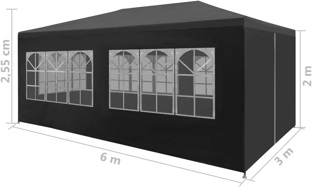 Het tuinpaviljoen is gemaakt van uv- en waterbestendig polyethyleen materiaal en is daarom zeer geschikt voor buitengebruik. Het frame is gemaakt van roestbestendig staal, waardoor het paviljoen stabiel en duurzaam is. De feesttent heeft zijpanelen, elk met decoratieve ramen, en 1 deurpaneel met rits voor eenvoudige toegang. De tent is eenvoudig te monteren.